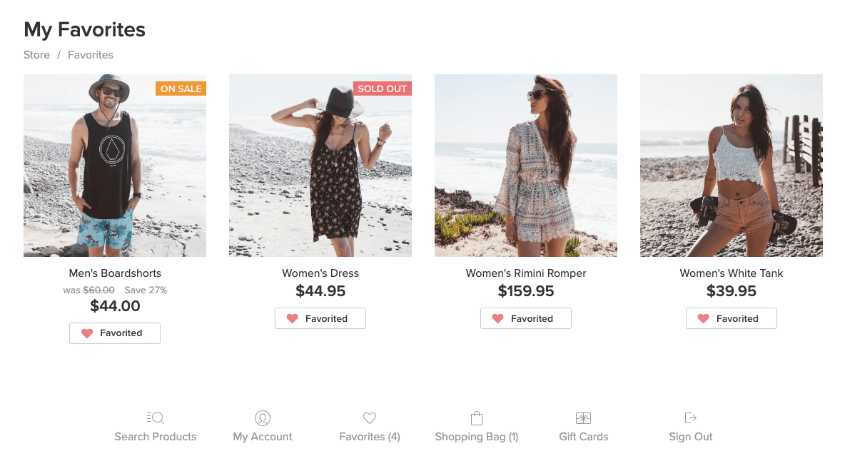 Customers who have a customer account can view their Favorites list either from their account by clicking on View favorites, or by clicking Favorites at the bottom of the storefront: