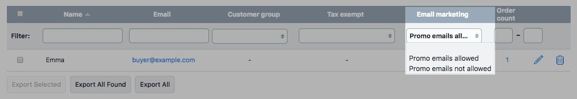 - Choose the Promo Email Allowed option in the Email Marketing filter: