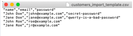 - Create a simple CSV file with a customer list using a text editor, Excel, or OpenOffice. This CSV file must have comma (",") as a delimiter and it must start with a header ("name","email","password"). You can import a customer’s name, email address, and password (optional).