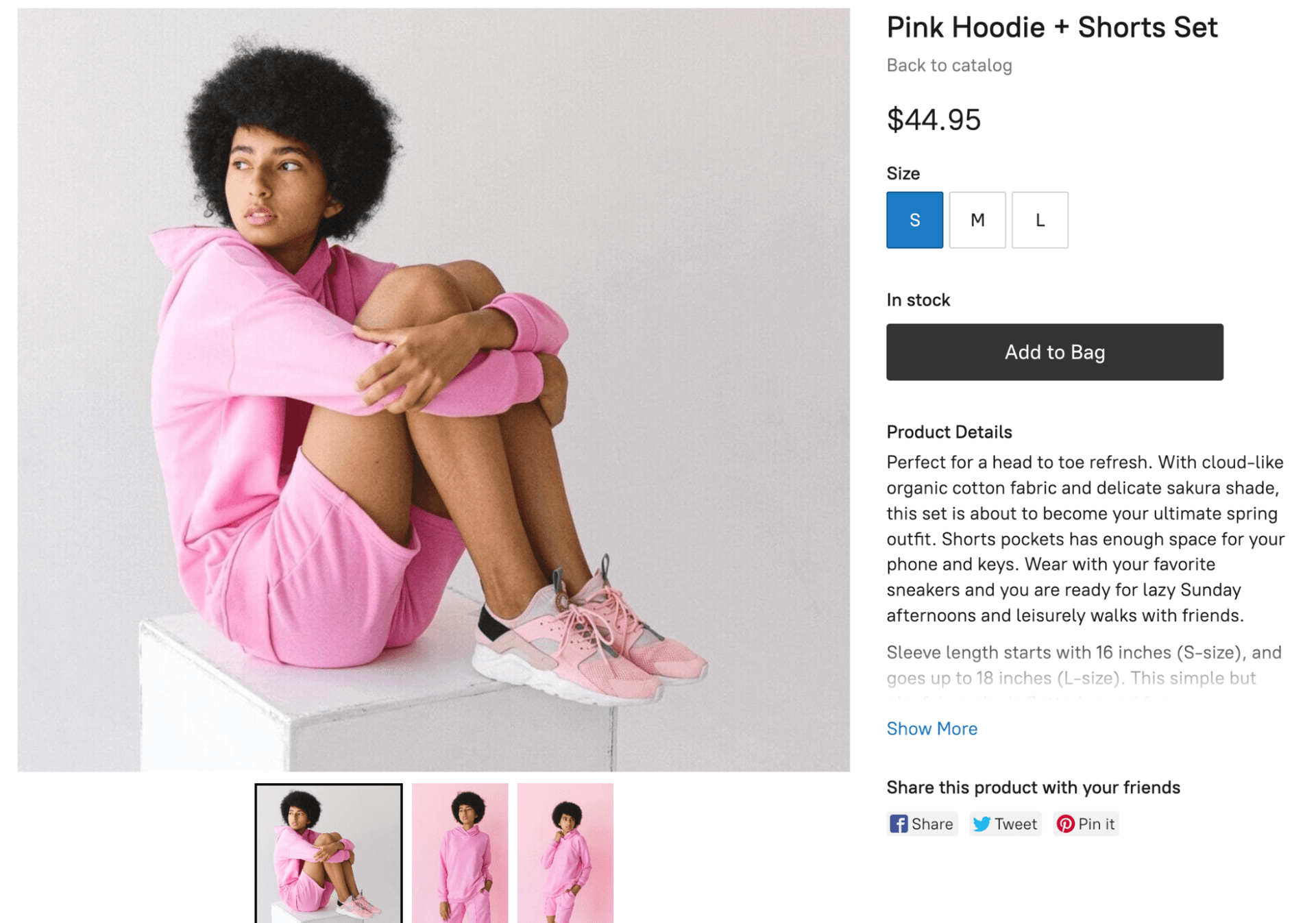 The product page is a page of a particular product in your store with all its details. Customers can access product pages by clicking a product card in the list, or by direct link.