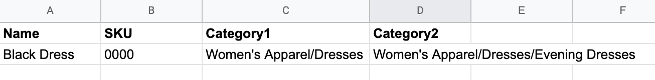 Example 2. Let’s say you want to add a new product named Black Dress with SKU 0000 and simultaneously create two new subcategories for it: Women's Apparel/Dresses and Women's Apparel/Dresses/Evening Dresses. This is how your file should look like in a spreadsheet (before you save it as CSV file for a further import):