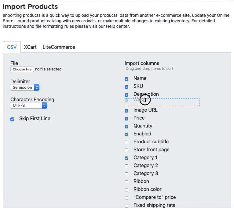 - In the Import columns list tick the columns that are present in your CSV file. Important: the column order must be the same as in the CSV file, please re-arrange them if needed (in order to do it you should drag-and-drop the list items).