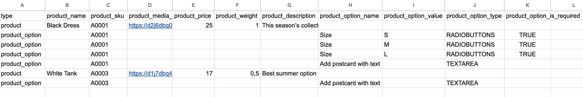 Then add the “product_option_type” column to the file header and enter “RADIOBUTTONS” as its value for the “product option” row.