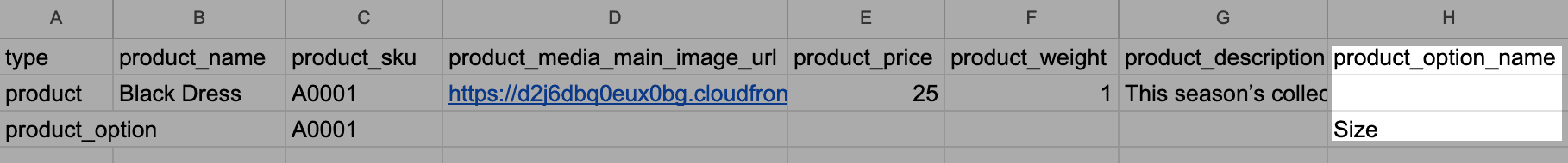Add the “product_option_name” column to the file header and enter “Size” as its value for the “product option” row: