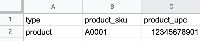 Then add the “product_upc” column to the file header and enter “12345678901” as its value for the “product” row: