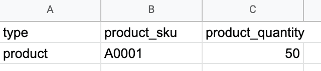 - Then add the “product_quantity” column to the file header and enter the new product quantity as its value for the “product” row (“50” in our example).
