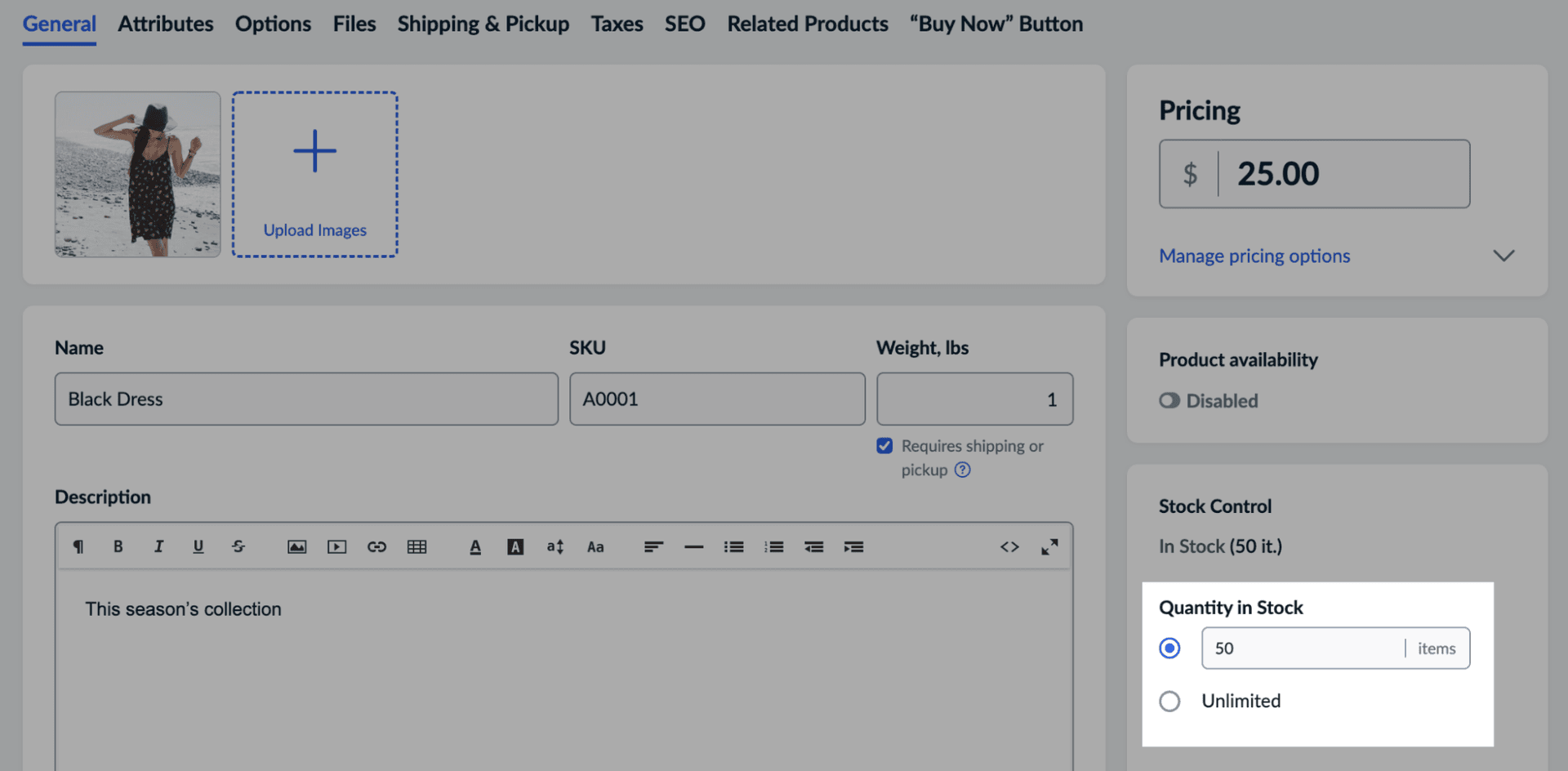 In our example, we’ll update product stock for the product from Case study 1 that already exists in your store: a black dress with SKU “A0001”.
