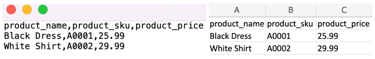 Here’s how the same CSV file looks when viewed in a plain text editor and in Excel: