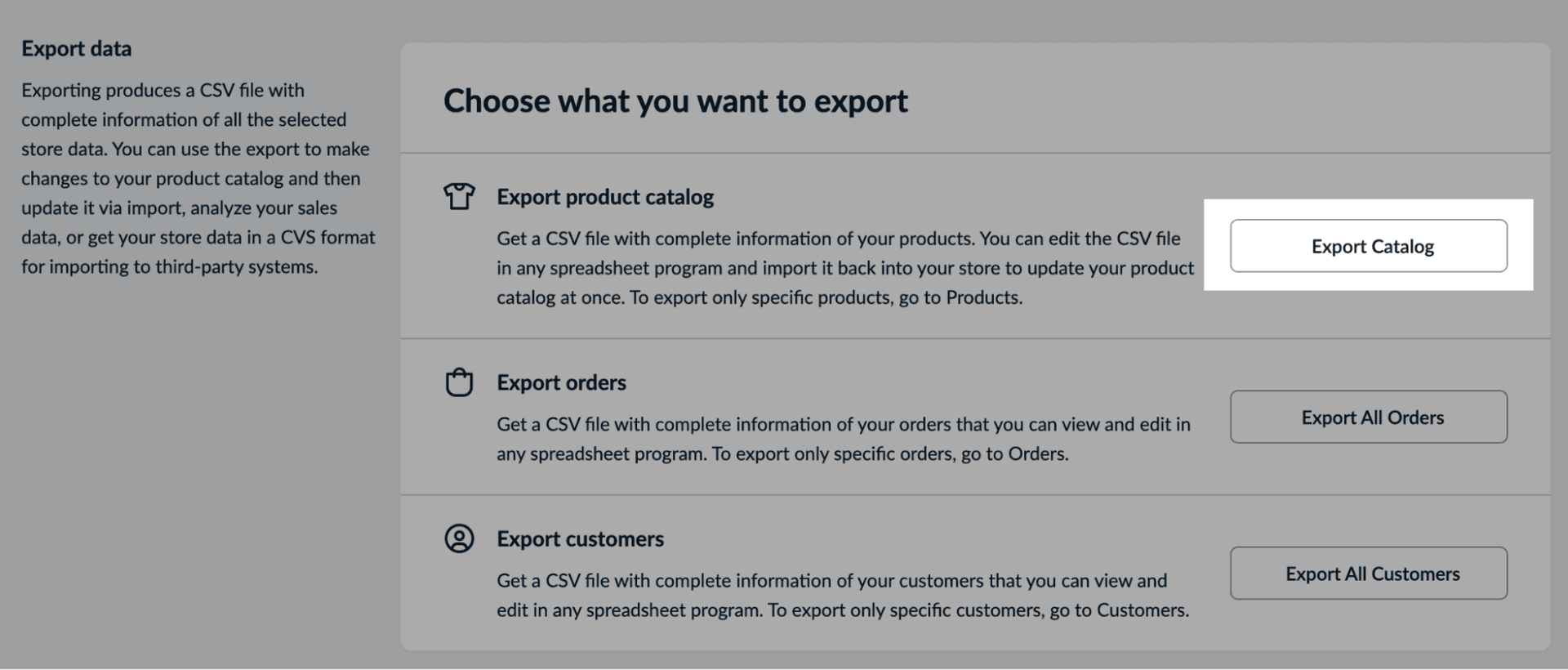 From the Catalog → Data Import & Export page, you can also export information on all your orders or customers by clicking Export All Orders and Export All Customers respectively. On top of that, you can export data on gift cards, abandoned carts (opens in a new tab), and Instant Site redirects.
