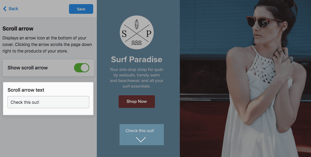 Under the Scroll Arrow menu you can hide the arrow that brings site visitors to the store section or add a text for it encouraging people to visit your store: