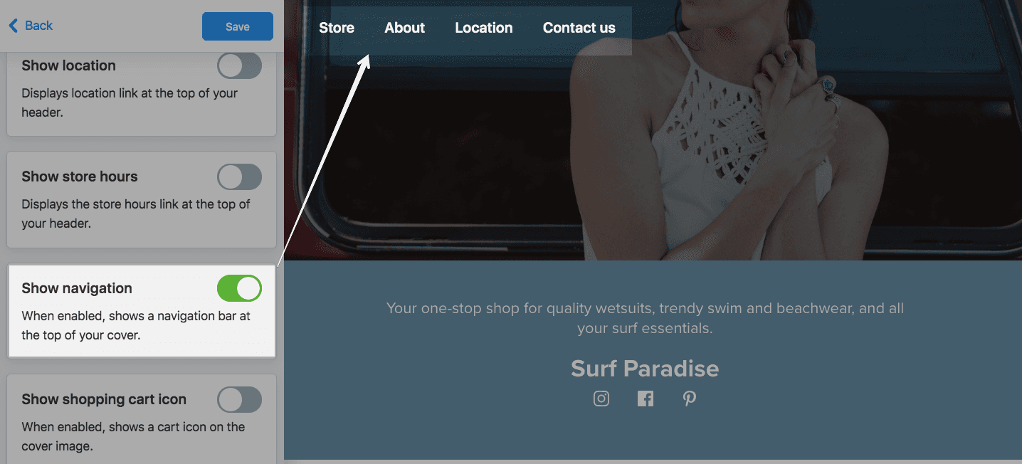 To change the header and give it a more traditional look, enable the Show navigation option. The navigation includes links to the following sections of your one-page Instant Site: Store, About Us, Location, Contact Us: