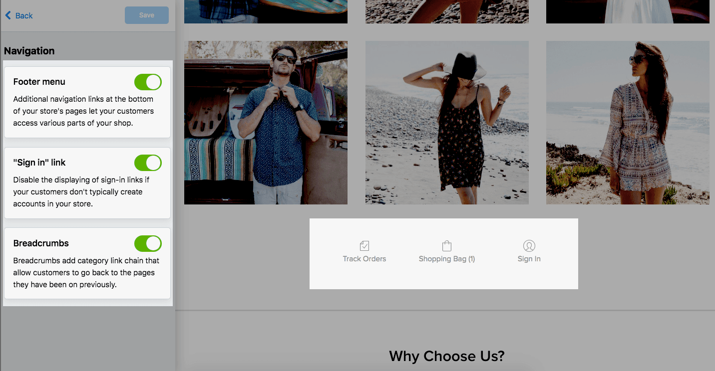 Store Design options replicate the settings of the Design page in your store admin. The changes you make here will affect all your storefronts.