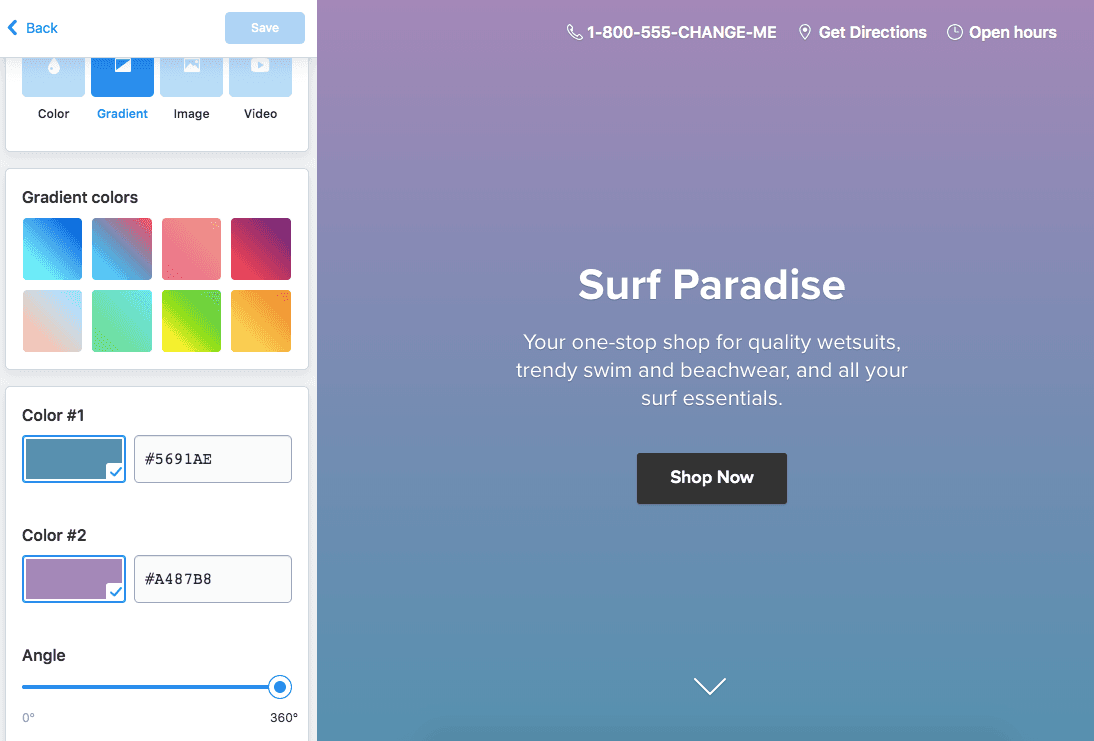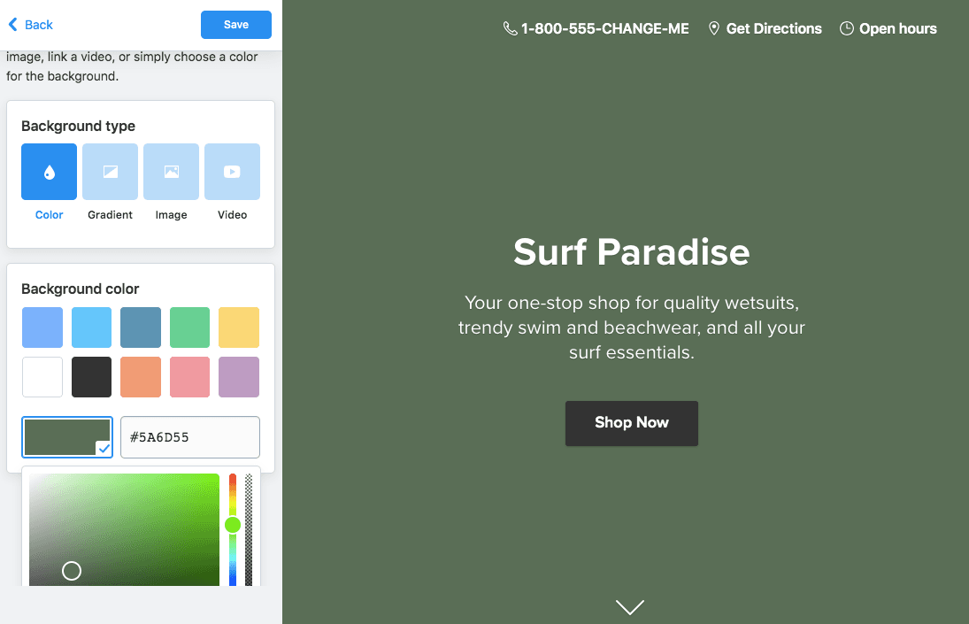 Under the Background options menu you can choose from Color, Gradient, Image or Video background types for your Instant Site first tile: