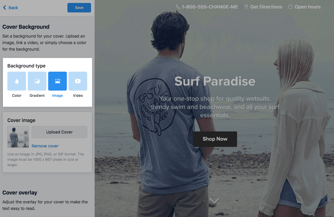 You can also edit the chosen theme: upload your own cover image, change the typography, etc. You can do this in the appropriate sections of the Instant Site editor.