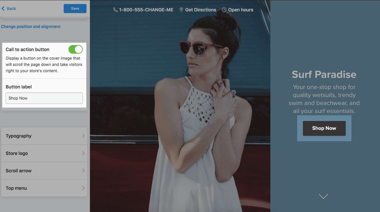 The Call to Action Button takes customers right to the product listing. By default, it is enabled and says “Shop Now”: