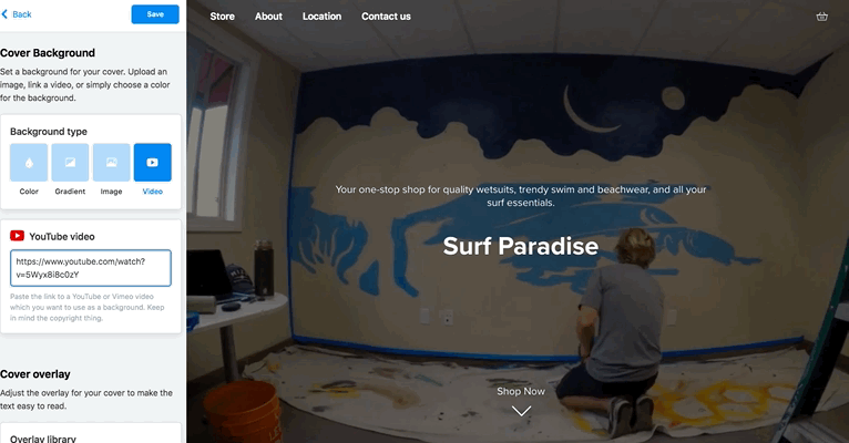 You can easily add a Youtube/Vimeo video as a cover background to showcase your best products or to animate your Instant Site for an event - just put the link for your video in the text field, save the changes and the video will soundlessly play in your cover background: