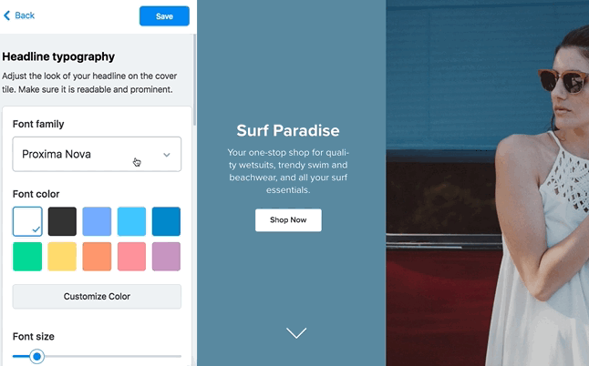 Besides that, under Typography, you can change how the headline and the Instant Site description appear - select the desired font from a drop-down with over 60 suggested fonts, increase or decrease their font size and pick any font color.
