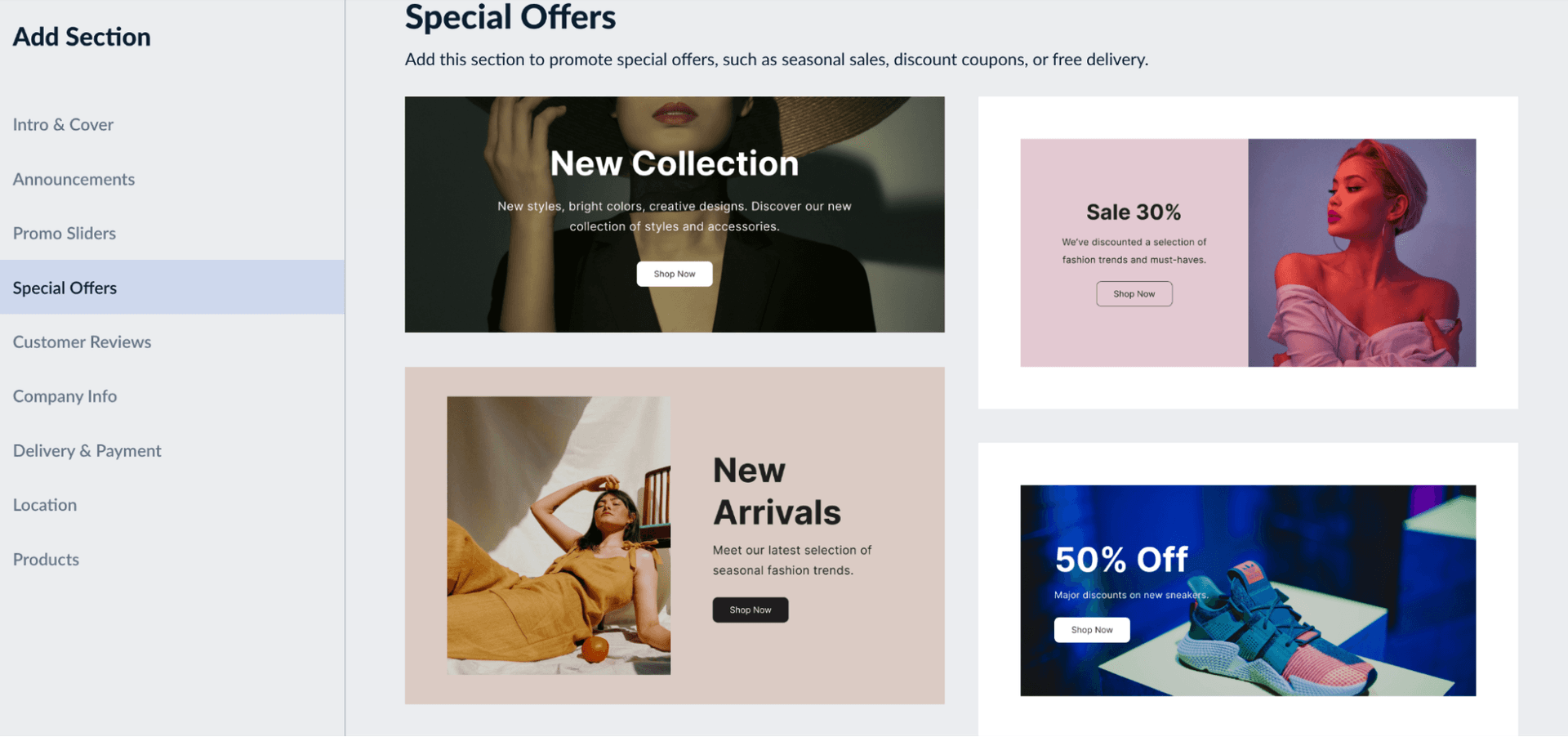 Each template you choose to build your site contains an e-commerce section. The section contains your featured products, and you can choose what products to show in your online storefront.