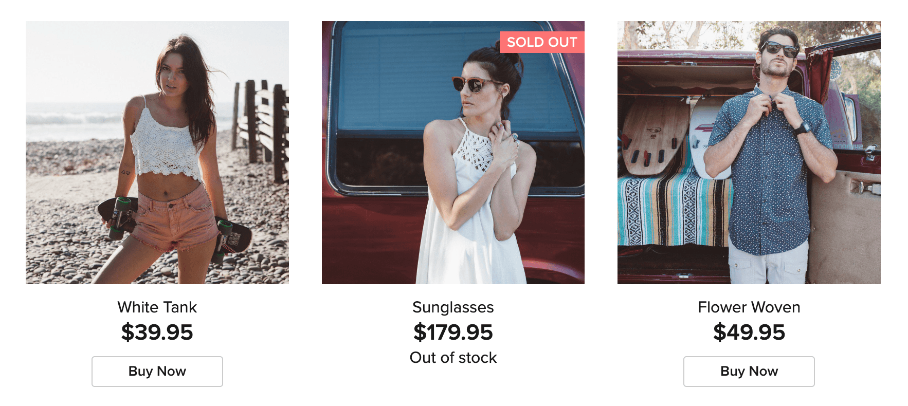 By default, all the new products that you create in your store are set to remain displayed on the storefront when sold out. Their quantity is marked as “Out of stock”/“Sold Out” and the “Buy Now” and “Add to Bag” buttons for these products become hidden so that they can’t be ordered:
