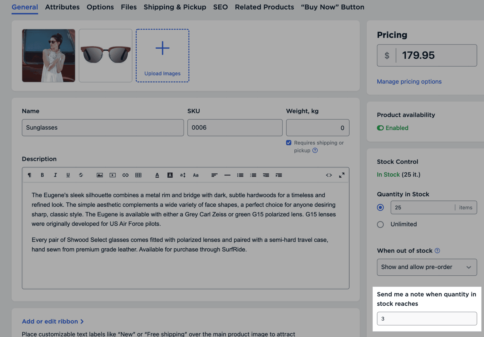 Simply enter the low stock value at which you would like to receive a notification, and the store will automatically send you an email when your product reaches this limit.
