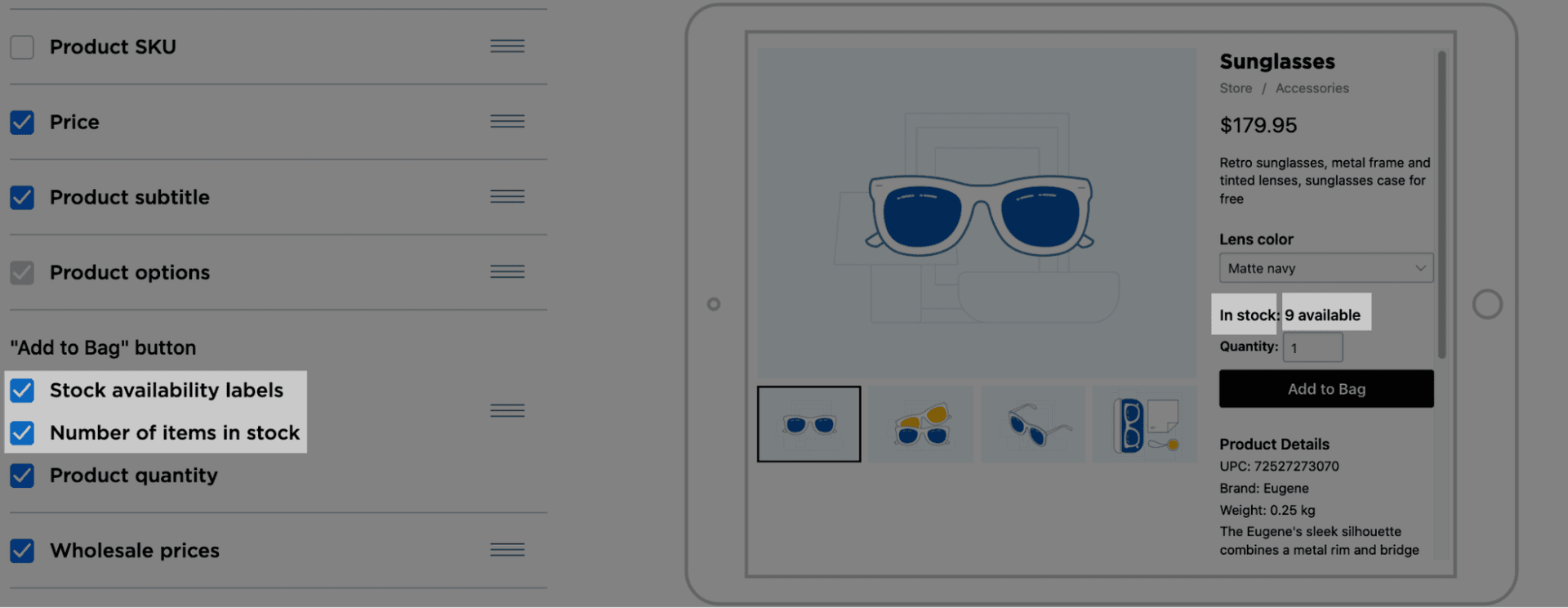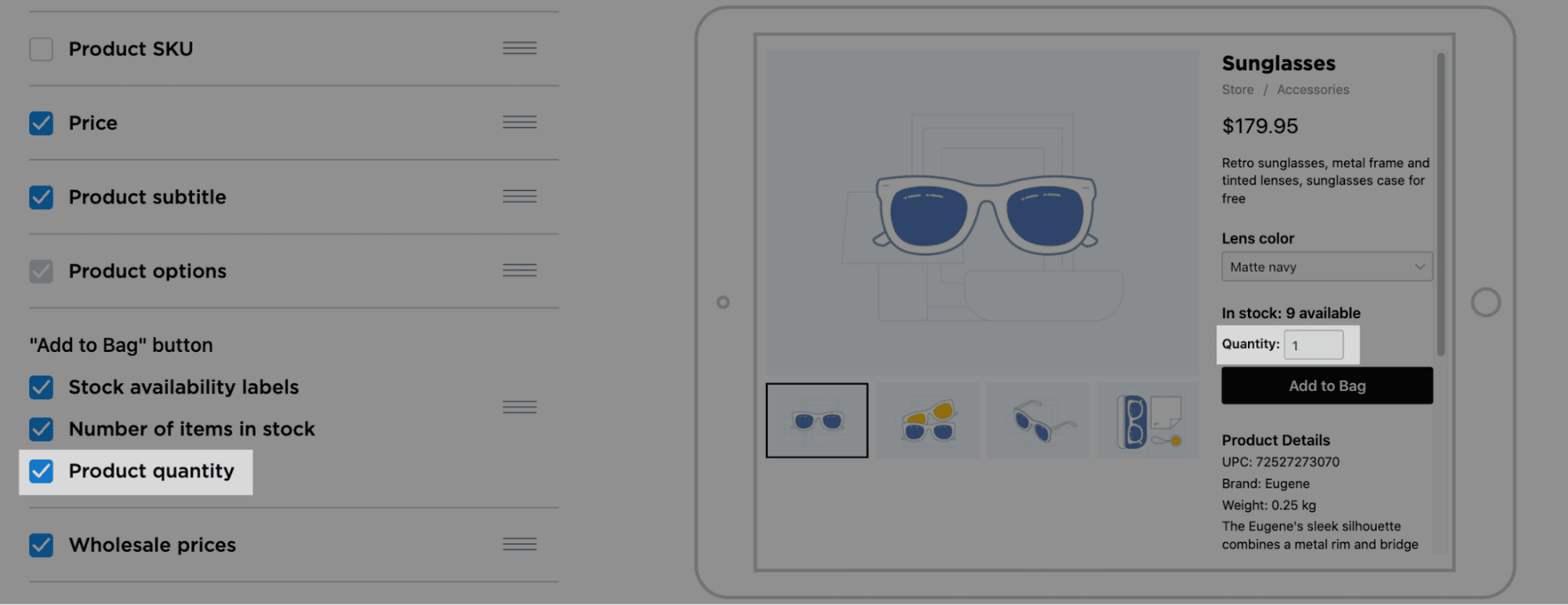 On product pages in your store, you can display the “in stock” status, products’ actual in-stock quantity, and a quantity field that allows customers to enter how many units of an item they want to add to cart.