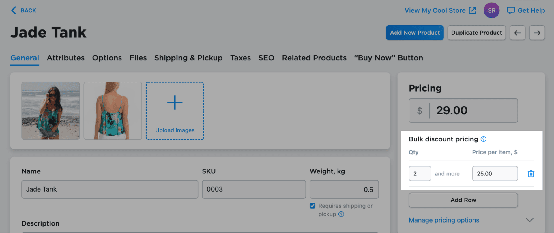 You can offer tiered pricing for each product and product variation in your store based on quantity. For example, a product costs $10, but if a customer buys five items, the price will be $9 each.