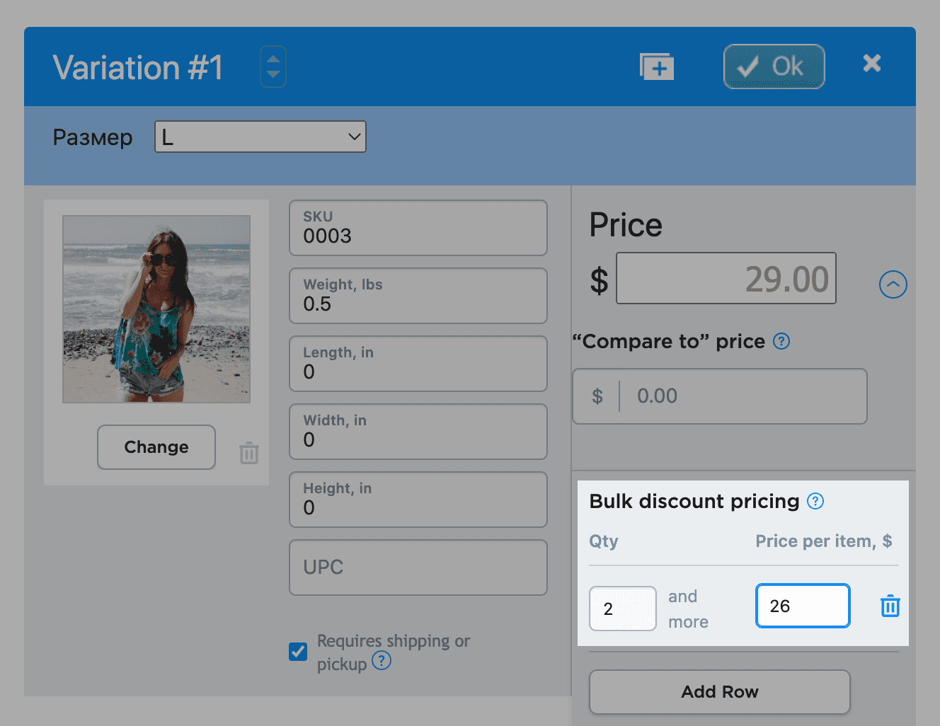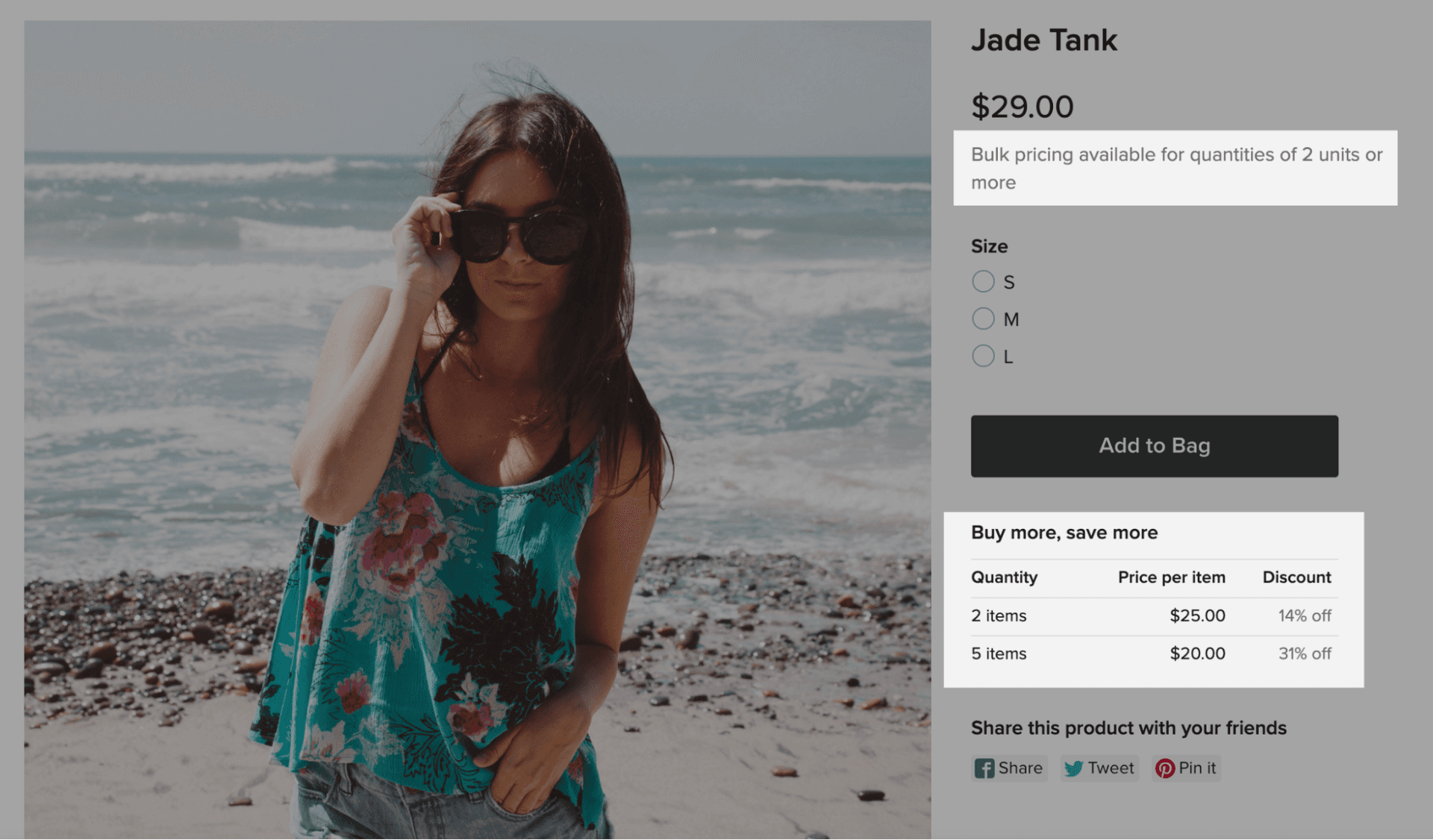 An item with bulk discount pricing needs to have one or several quantity tiers with prices that are lower than the initial price of the product.