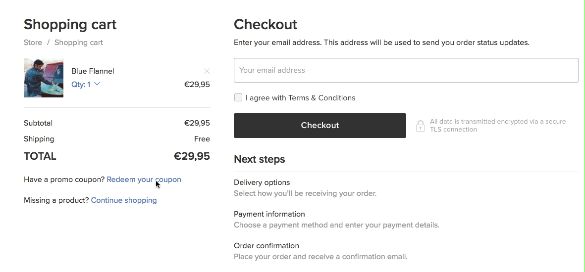 To enter the discount code at checkout, a customer should click on Redeem your coupon link to access the coupon field. If you often offer your customer discounts via coupons or gift cards, you can expand the coupon field so shoppers can enter promo codes right away:
