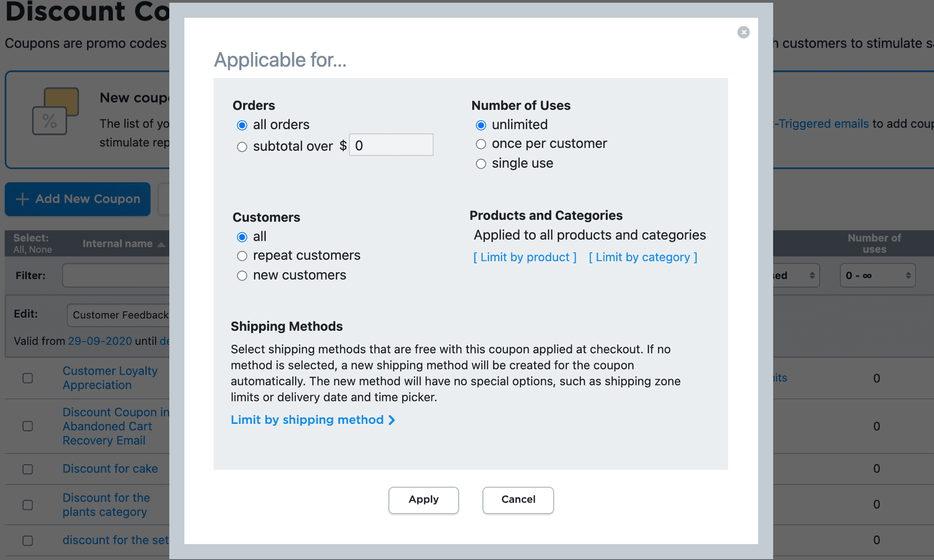 Here you can configure which orders, customers and products the coupon should apply to. The Shipping Methods can be set up only for coupons with the free shipping option: