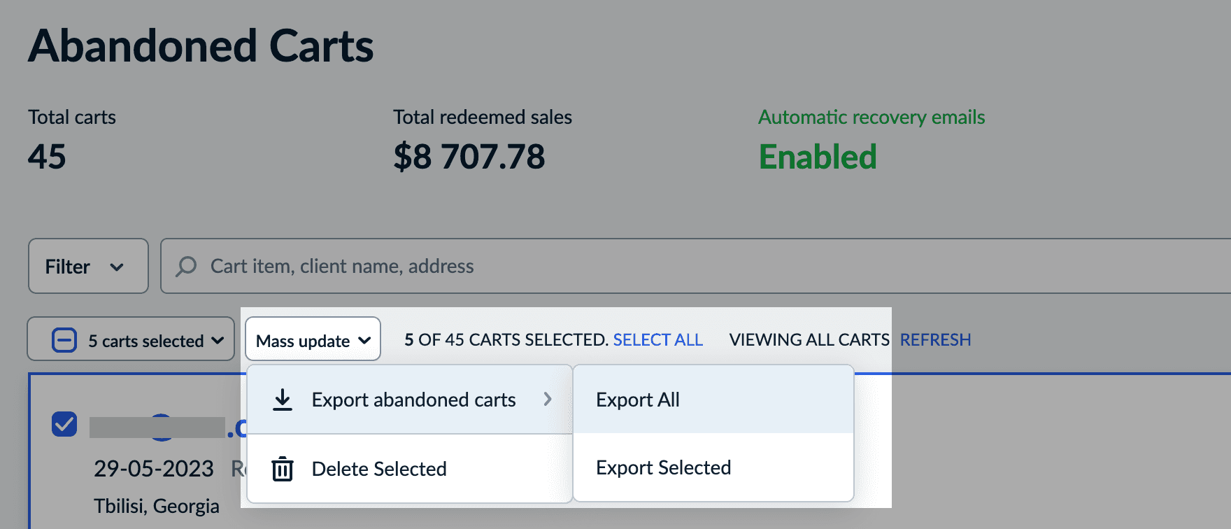 - Tick all the carts you want to delete. You can use filters in the upper left corner or the search field at the top of the abandoned cart list to find specific carts.