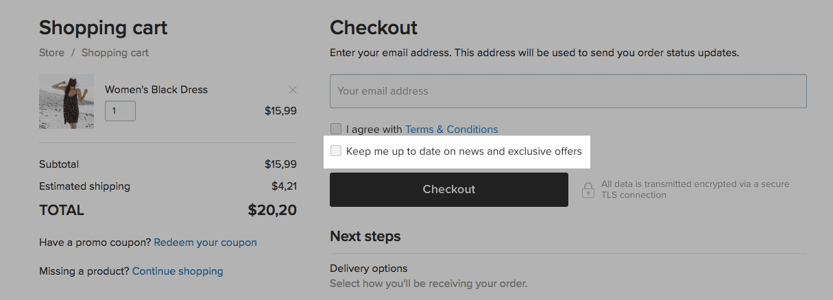 Once it’s enabled, the “Keep me up to date on news and exclusive offers” checkbox will appear above the Checkout button in your store: