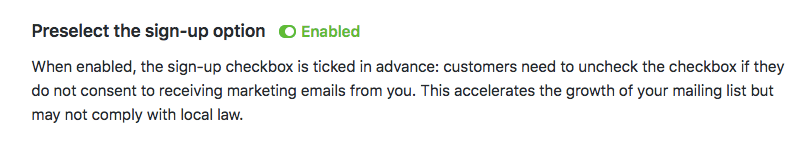 If you enable this setting, the sign-up box will be shown with a checkmark within it. Your customers will need to untick this box if they are not interested in receiving promo emails.