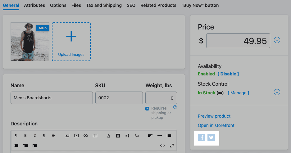 You can share product information to your business and personal Facebook Page Timeline or Story and Twitter right from a product editing page.