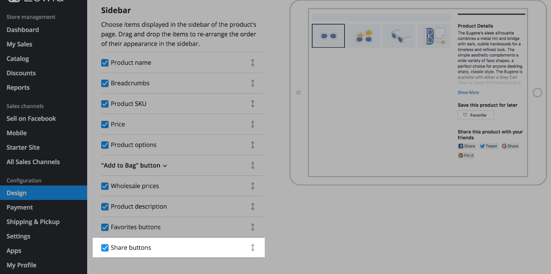 For Instant site users: you can also enable share buttons on your website editor, go to Website → Edit → Store → Product page → Sidebar.