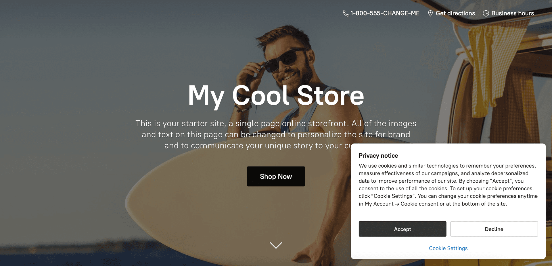 Once enabled, the cookie consent banner will appear on the pages of your store with the option to accept, partially accept, or decline. Refresh the storefront page to see it. It will also appear on the front page of your Instant Site if you’re using its original version: