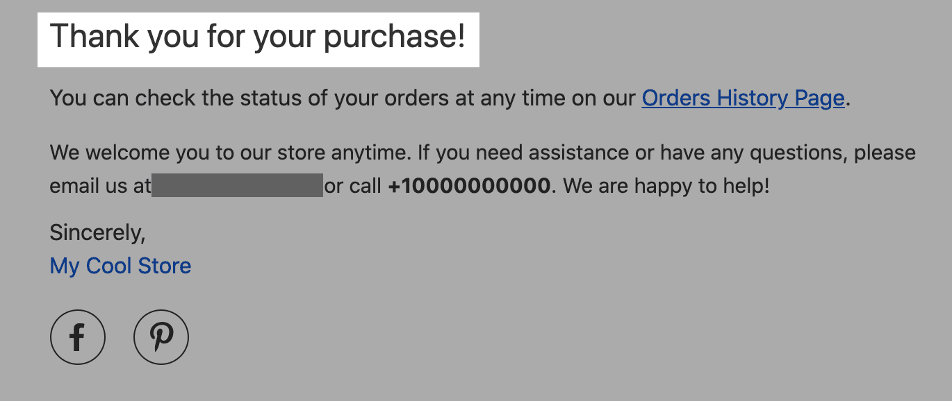 For example, to replace the default “Thanks for shopping with us!” text at the bottom of your order confirmation email, you need to find <@rosetta.message key="OrderConfirmation.thanks" /> and replace it with your text (e.g., “Thank you for your purchase!”):