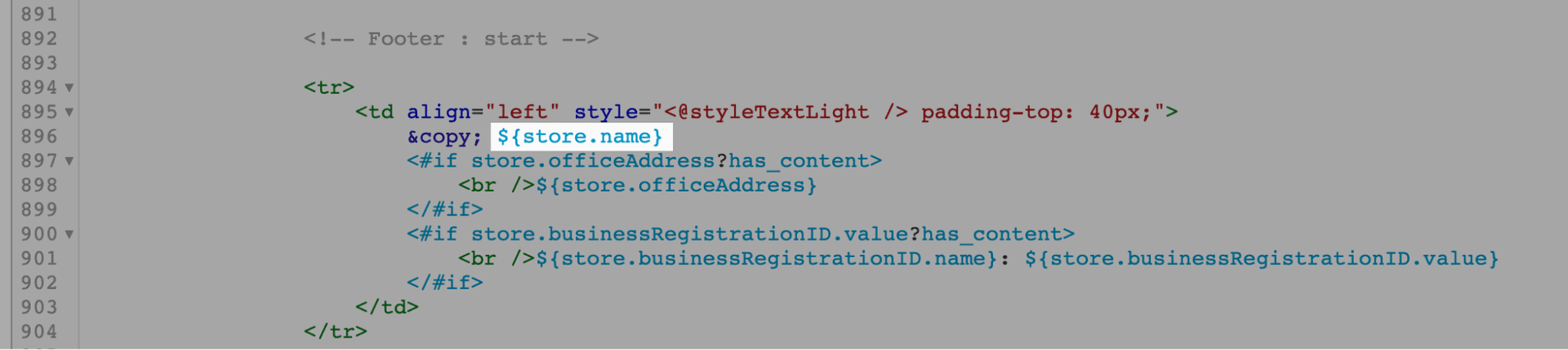 For example, if you want to show another company address in emails (not the one that you specified in your store profile), you can replace the ${store.officeAddress} variable with the address that you want to show in emails by adding the latter as plain text.