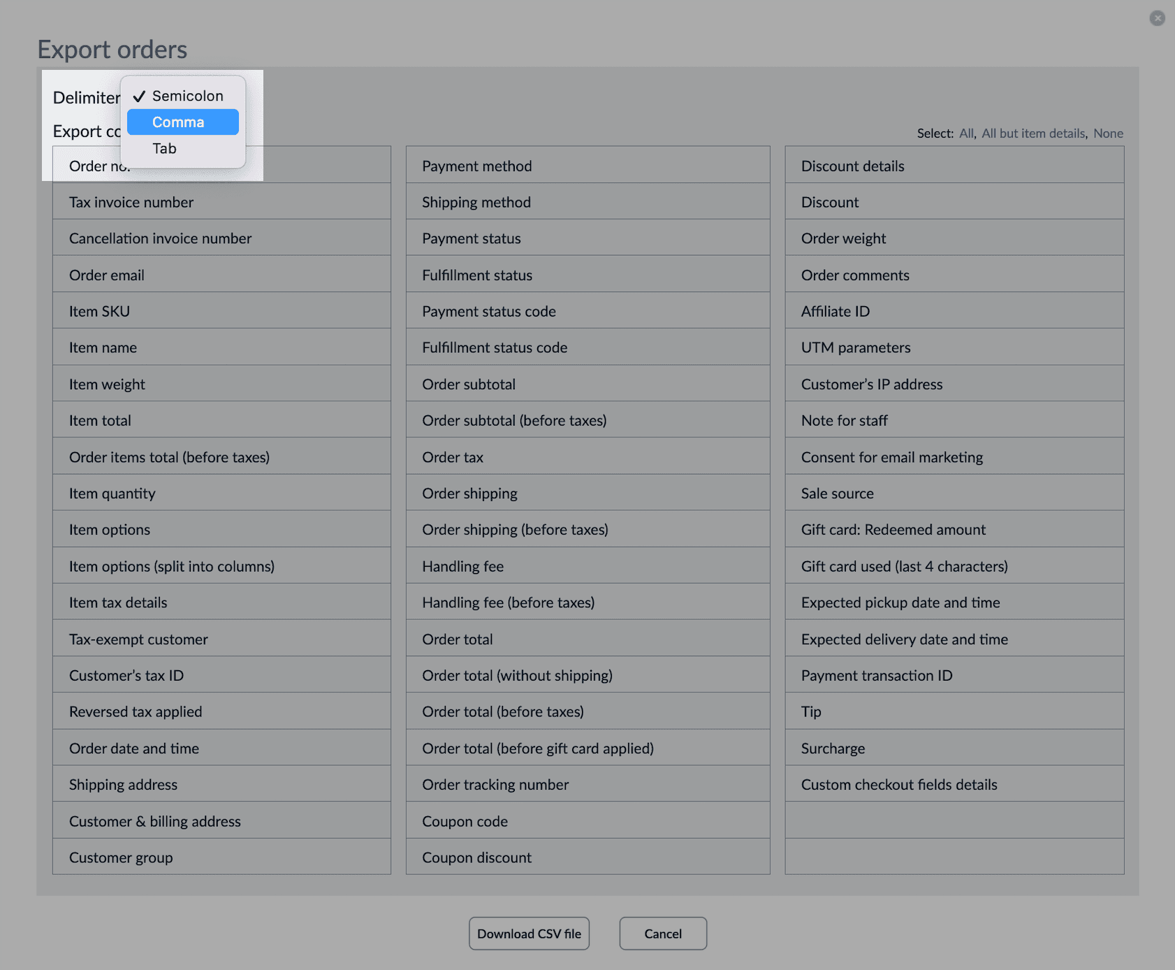 💡To export all product options and their values into one dedicated column, choose "Item options" in the dialog. To export each product option into a separate column, choose "Item options (split into columns)".