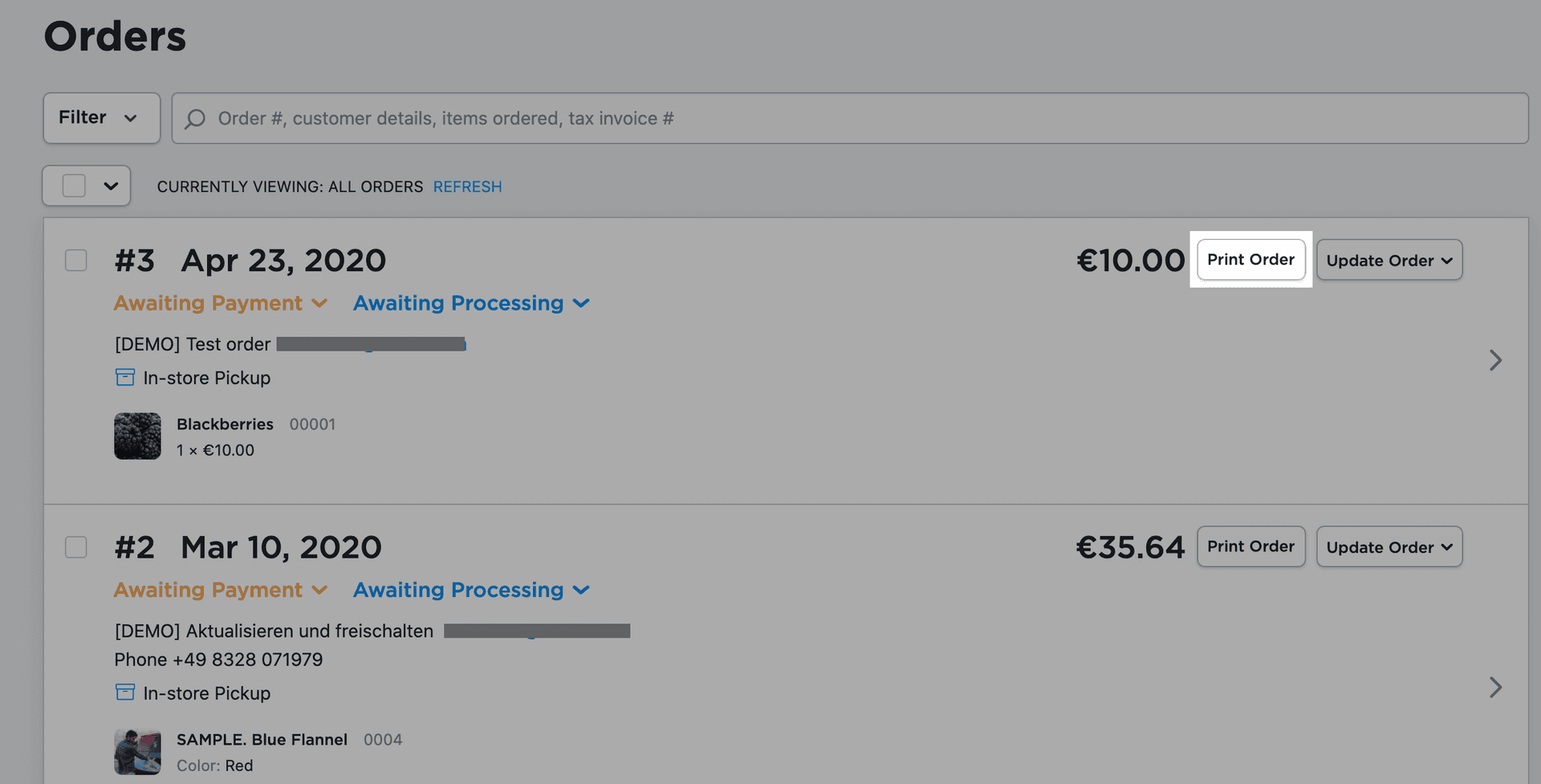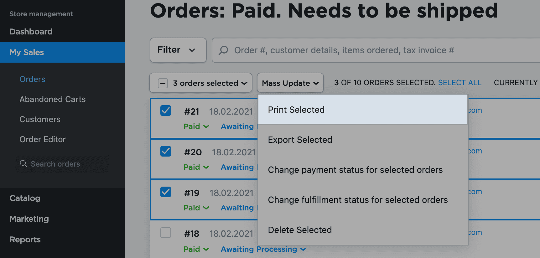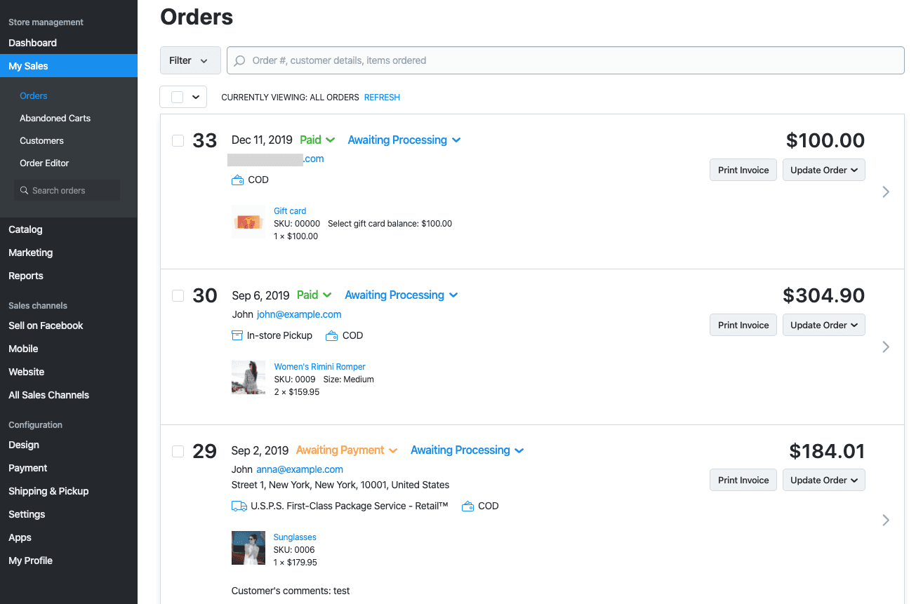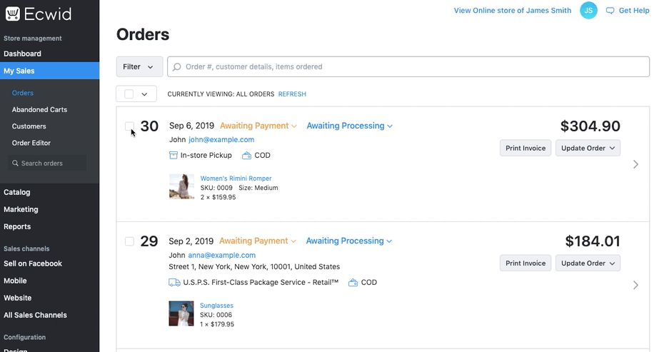 On this page you can also manage your orders: update order statuses, review each order’s details, search for orders, filter them by different categories, update orders and customer information, add a tracking number for shipping, etc.