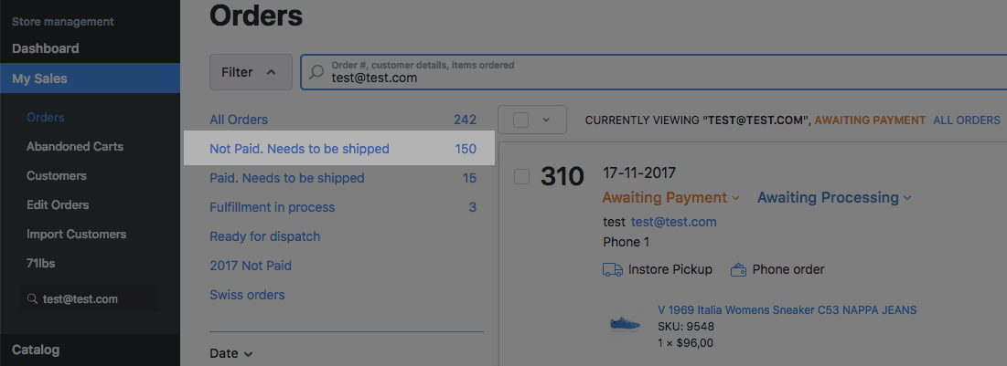 For instance, if you want to reach out to customers to settle their payment before shipping their order, then you will need to filter for a list of orders that haven't been paid yet and need to be shipped. In this case, you can use a preset filter Not paid. Needs to be shipped: