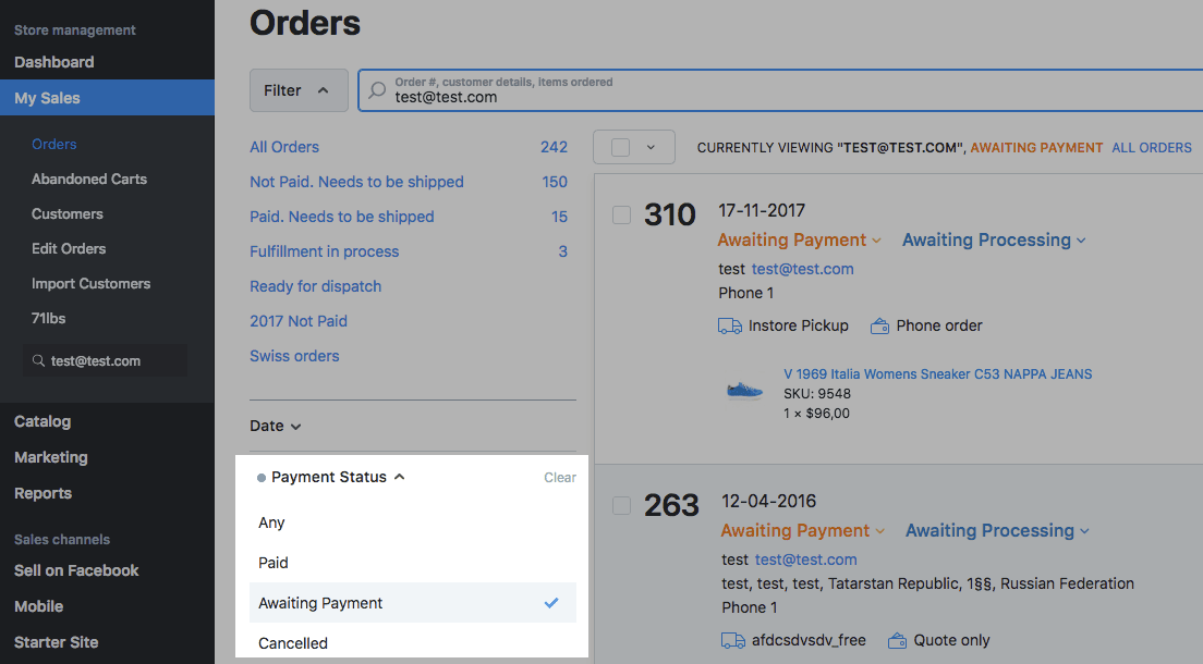 You can apply multiple filters at once to narrow your search. For example, if you want to see orders that have not yet been paid for and were placed by a particular customer, you can enter the customer's name in the search bar and select Awaiting Payment from the Payment Status dropdown: