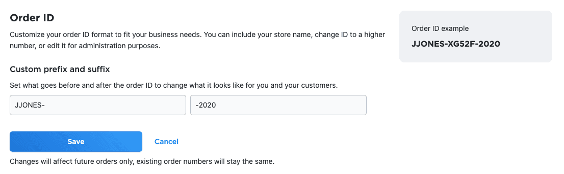 Enter a prefix or a suffix (or both) that you want to appear in your order IDs and check the preview on the right. Example: