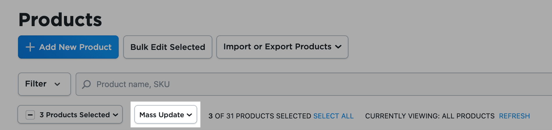 Before entering the Bulk Product Editor, you need to choose which products you want to update. You can either mass update all the products in your store or select several items.