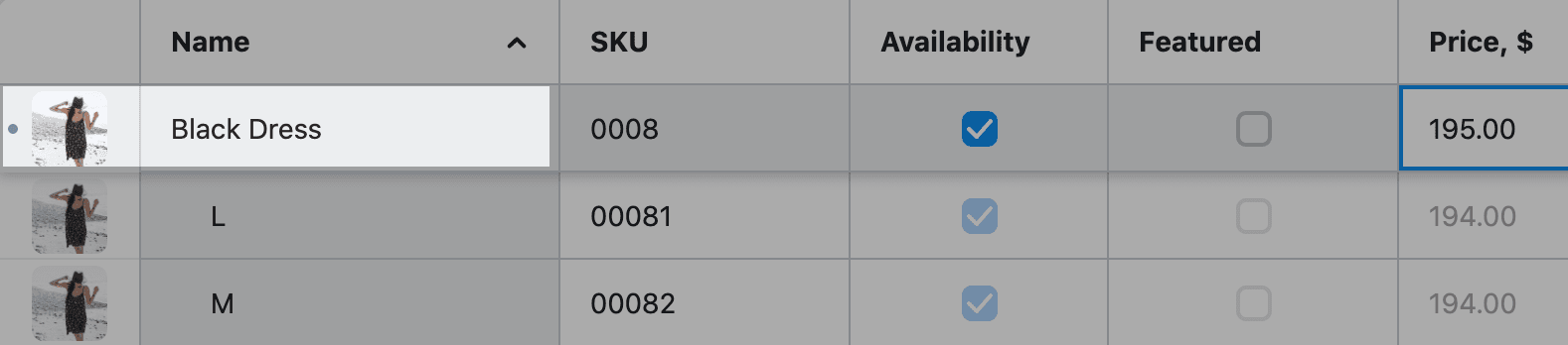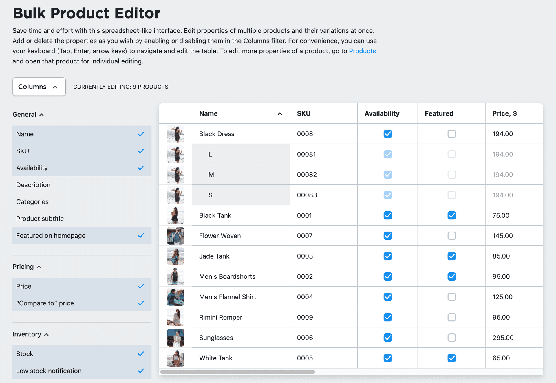 You can use Bulk Product Editor to mass update products and product variations in your online store. This tool allows you to edit multiple product properties, including name, SKU, images, price, stock, shipping settings, etc. Product info is presented in a tabular form which makes the mass editing process fast and easy.