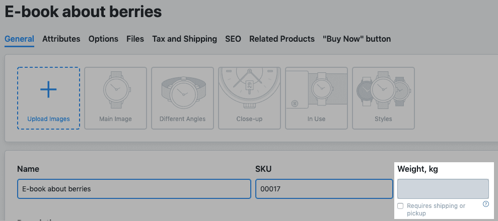 - Under the Shipping and Pickup section, click Requires shipping or pickup option and toggle the button to disable shipping.