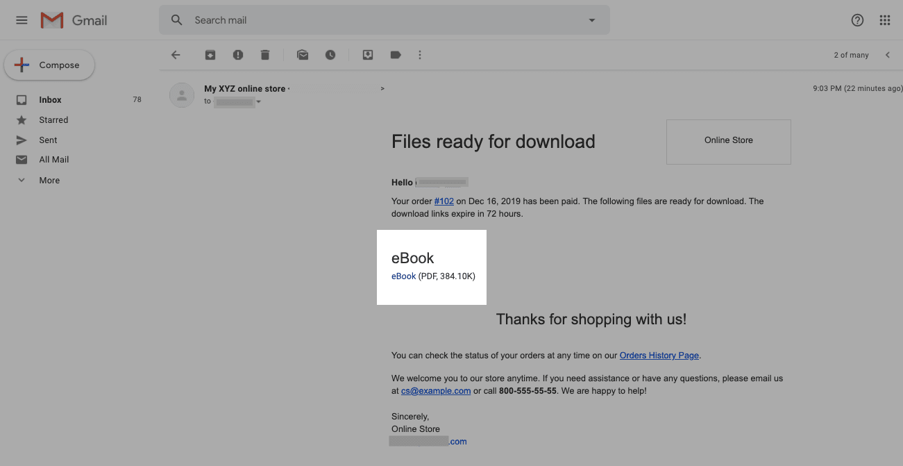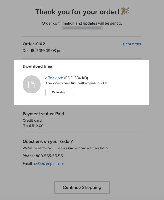 A buyer sees the download link right on the Thank you for your order page if their order is paid online: