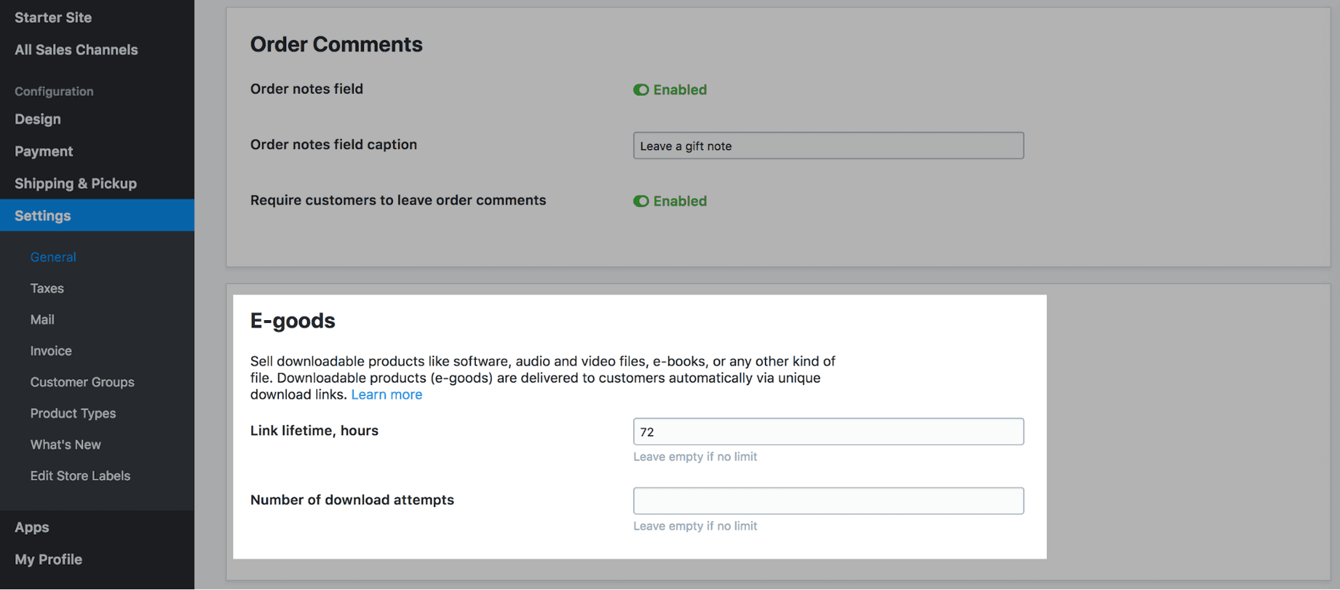 - Lifetime is left empty, and the number of download attempts is set at 5: the link is available without any time limits but can only be downloaded 5 times per order.