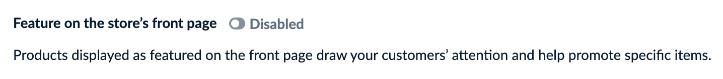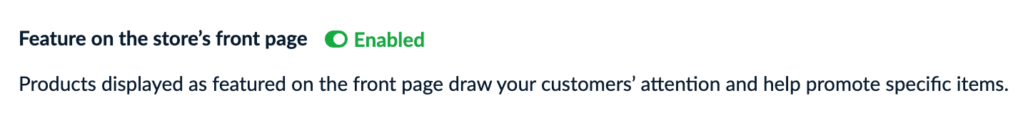 💡If the toggle is enabled but inactive, the product is already assigned to the Store Front page category, and it's the only category it's currently assigned to.