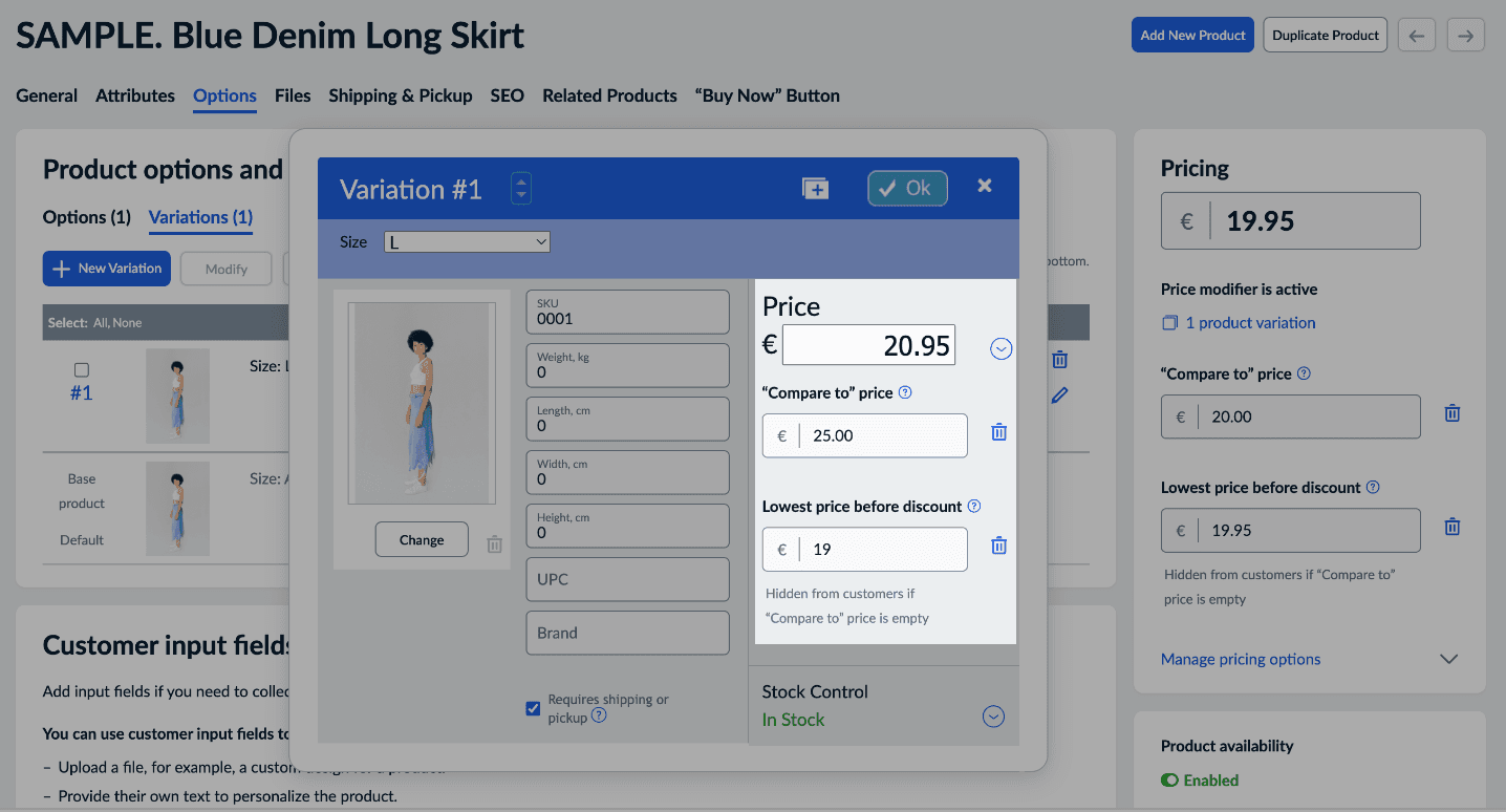 If your product has variations, you can also set individual lowest prices before discount for each variation. To set lowest prices for several items in bulk, use the Bulk Product Editor.