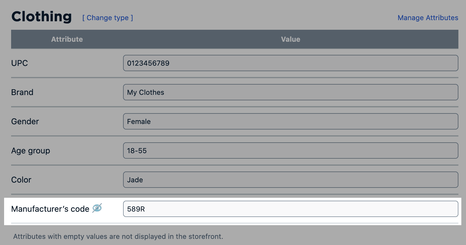 With the help of hidden product attributes, you can keep product specifications that you use for internal purposes in your store admin without publishing them online. For example, you can use them as a place for manufacturer’s codes, your internal notes, etc.